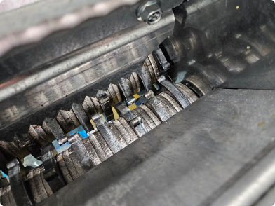 Our device crushes packaging using two rotating shafts with teeth, the main driven one and a secondary one coupled to it. A special gear motor ensures correct rotation speed and force. All of this, combined with the third shaft above the other two, allows for smooth operation without jamming.